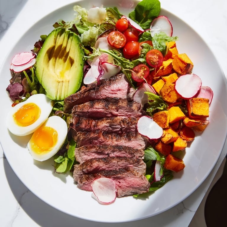The beauty of this bowl is that it respects the ingredients rather than hiding them. The beef stays tender and flavorful because it's seared quickly and sliced thin; the sweet potato becomes almost caramelized at the edges; the avocado is there to add creaminess without heaviness. Everything has a reason to be there, and everything shows up in your mouth with its own identity. This is the kind of dish that changes how you think about putting meals together because you realize that good ingredients, minimal fuss, and thoughtful seasoning matter more than complexity.