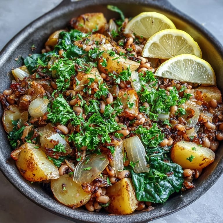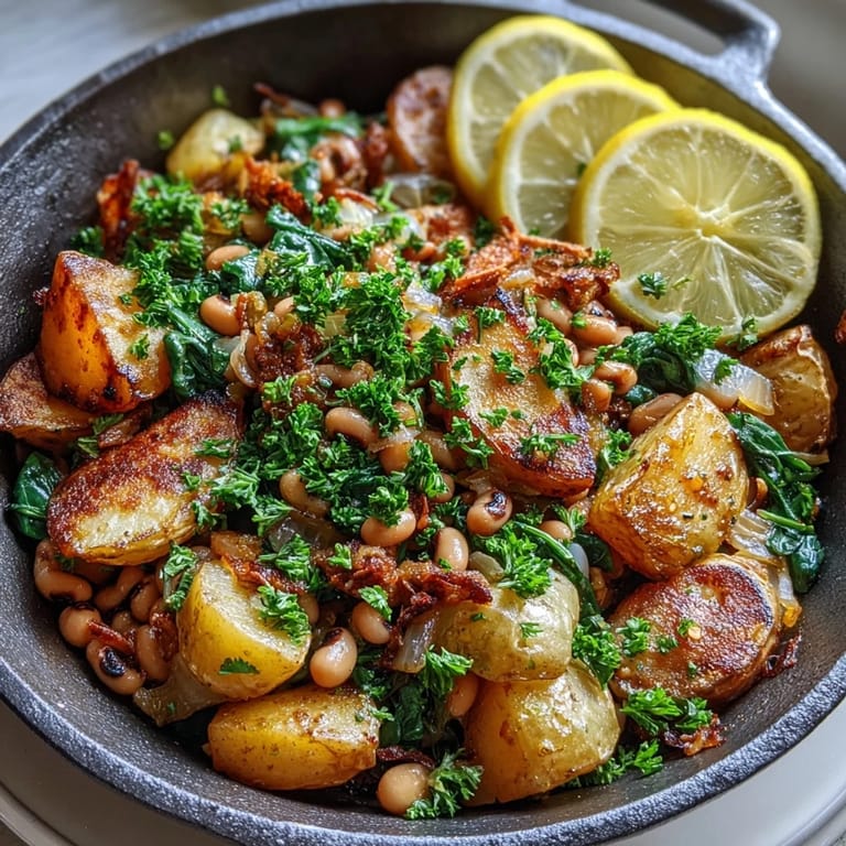 Pin It There's something about the sound of onions hitting hot oil in cast iron that signals the start of something good. My neighbor knocked on my door one chilly evening, mentioning she'd picked up too many vegetables at the farmers market, and within twenty minutes we'd thrown together this black-eyed pea skillet without a second thought. What started as improvisation became the meal we made every other week after that, each time tweaking it slightly based on whatever was in the crisper drawer.
