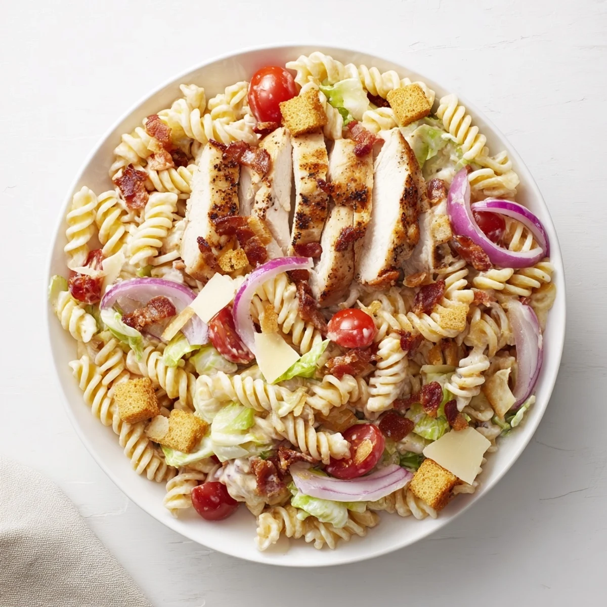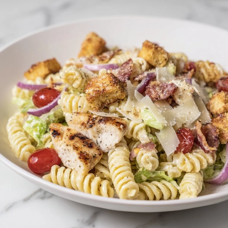 Swap the rotini for bowtie or penne if that's what you have on hand. Use Greek yogurt instead of mayonnaise for a lighter, tangier dressing. Add diced avocado, cucumber slices, or swap turkey bacon for a different flavor profile. You can also toss in some artichoke hearts or sun-dried tomatoes if you want a more Mediterranean vibe. Leave out the anchovies if you're feeding picky eaters, but know you'll lose some of that classic Caesar depth.