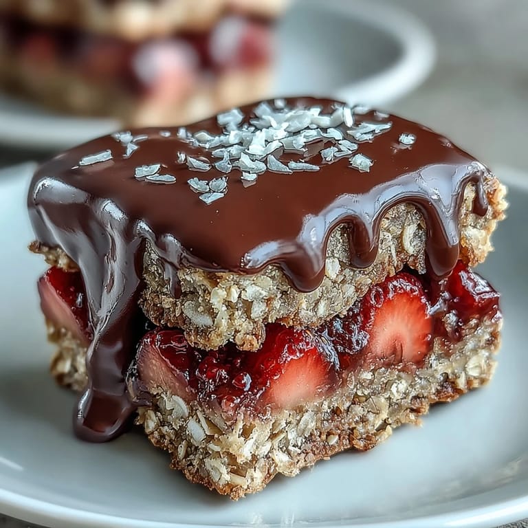 Pin It My neighbor showed up at my door one afternoon with a tin of these bars, still slightly warm from her kitchen, and I understood immediately why she couldn't stop making them. The combination of chewy oats, tart-sweet strawberry, and that satisfying chocolate snap felt like someone had figured out the exact formula for comfort. I've been making them ever since, usually on lazy Sundays when I want something that looks fancy but requires almost no actual baking skills. They've become my go-to gift, the kind of treat people ask about before they've even finished eating one.