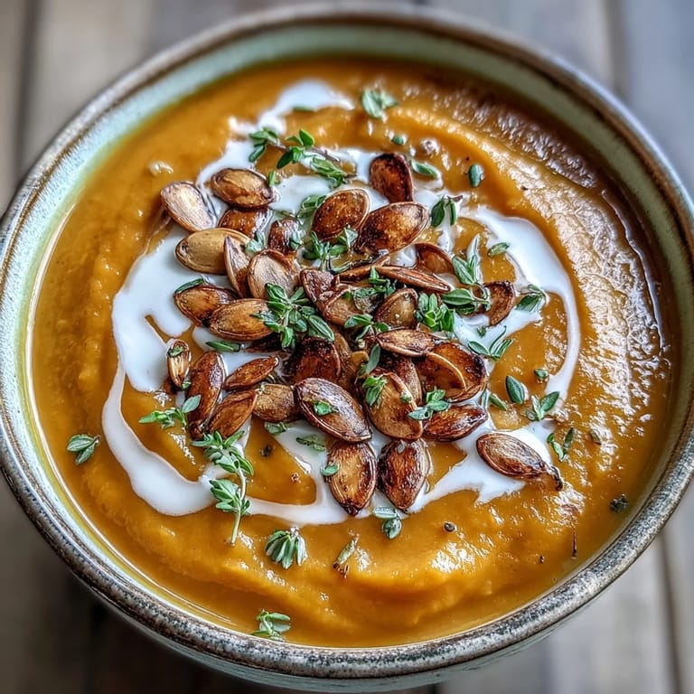 Serve piping hot in warmed bowls, topped with a swirl of heavy cream or coconut milk, toasted pumpkin seeds for crunch, and fresh thyme leaves. Crusty bread, focaccia, or crackers make excellent accompaniments for dipping.