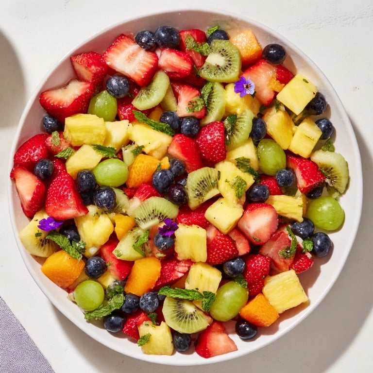 Fresh mint leaves and edible flowers provide a festive and elegant finish to the fruit medley.