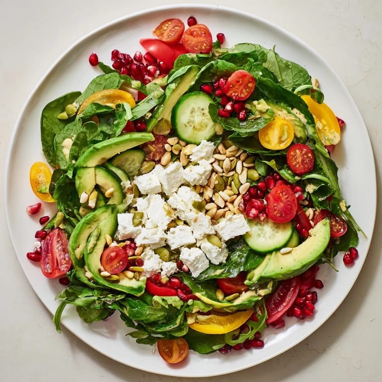 - Sprinkle feta and pine nuts across the entire salad, with a gentle concentration toward the center. This adds pockets of richness and keeps the eye moving across the plate.