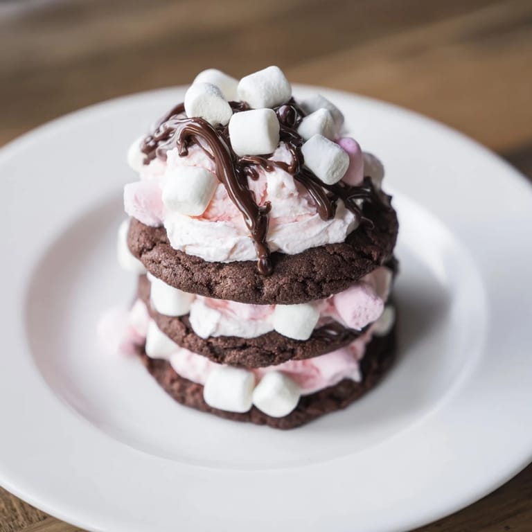 A playful, decadent dessert featuring layers of chocolate cookies and fluffy marshmallow frosting, stacked to resemble a cozy mug of hot cocoa.