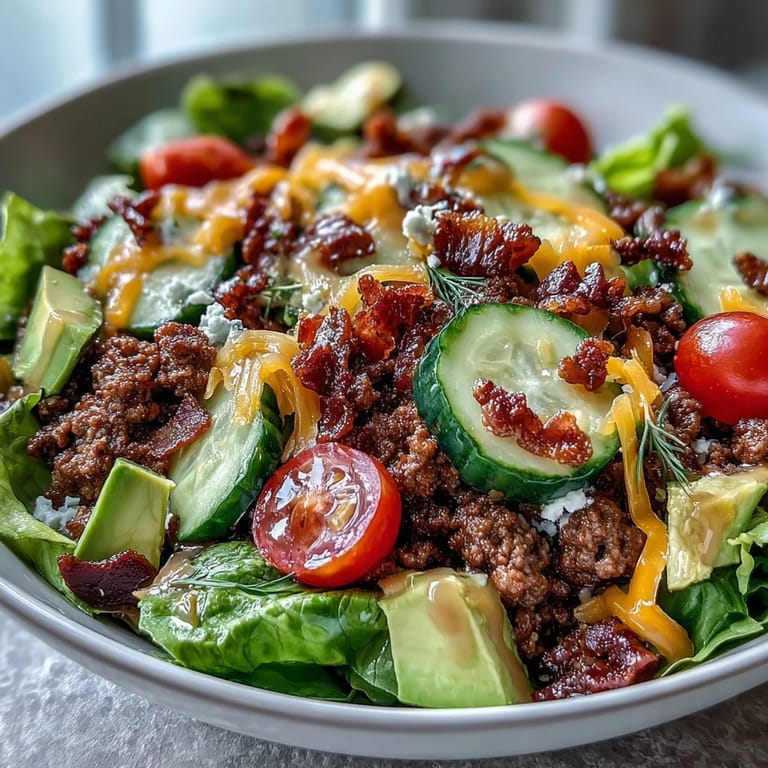 Pin It My brother called me one Tuesday asking if I could make something that wouldn't derail his new diet but wouldn't taste like punishment either. I had bacon in the pan within minutes, and by the time the ground beef hit the skillet, I realized I was building a salad that tasted exactly like the burger we used to split at our favorite diner—just without apologizing for it afterward. That's when this salad became my answer to cravings that didn't need to be complicated.