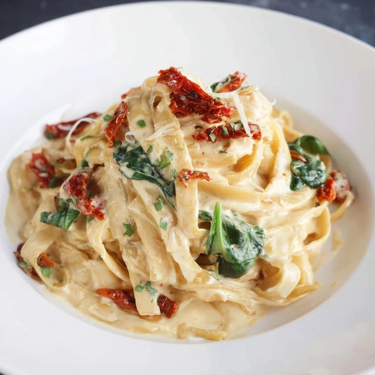Pin It A luscious, comforting pasta dish simmered in a single pot, featuring tender noodles, sun-dried tomatoes, spinach, and a medley of fresh herbs in a velvety garlic cream sauce.