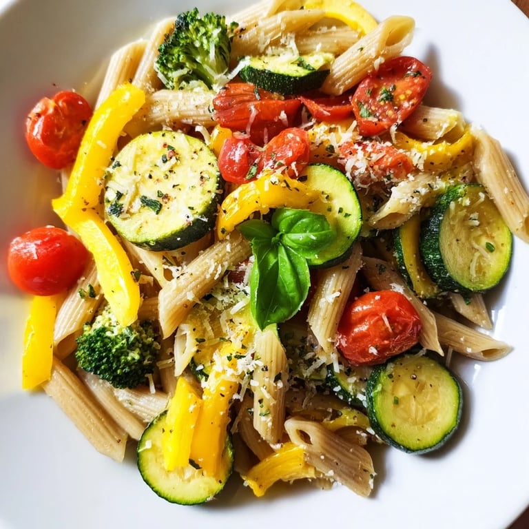 Pin It The smell of garlic hitting warm olive oil always pulls me back into the moment, no matter how hectic the day has been. I started making this pasta on a Sunday afternoon when I had too many vegetables in the fridge and no clear plan. The oven did most of the work, coaxing sweetness out of the peppers and zucchini while I boiled water and grated cheese. It turned into one of those meals that feels both simple and celebratory, the kind you can throw together on a weeknight or serve to friends without stress.