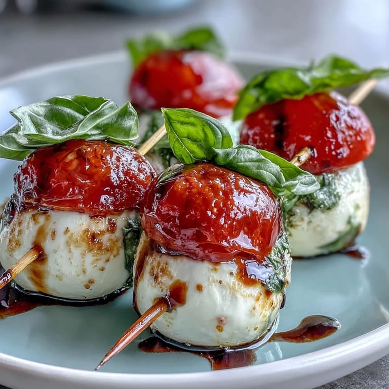 These skewers are best served at room temperature, which is actually a huge convenience when you're hosting. Make them an hour or two before your guests arrive, keep them covered lightly on the counter, and the flavors actually deepen as they sit. If you refrigerate them, take them out about twenty minutes before serving so the mozzarella softens back to that creamy texture. The cold kills the flavor of good cheese, and that seems like a waste when cheese is half the point.