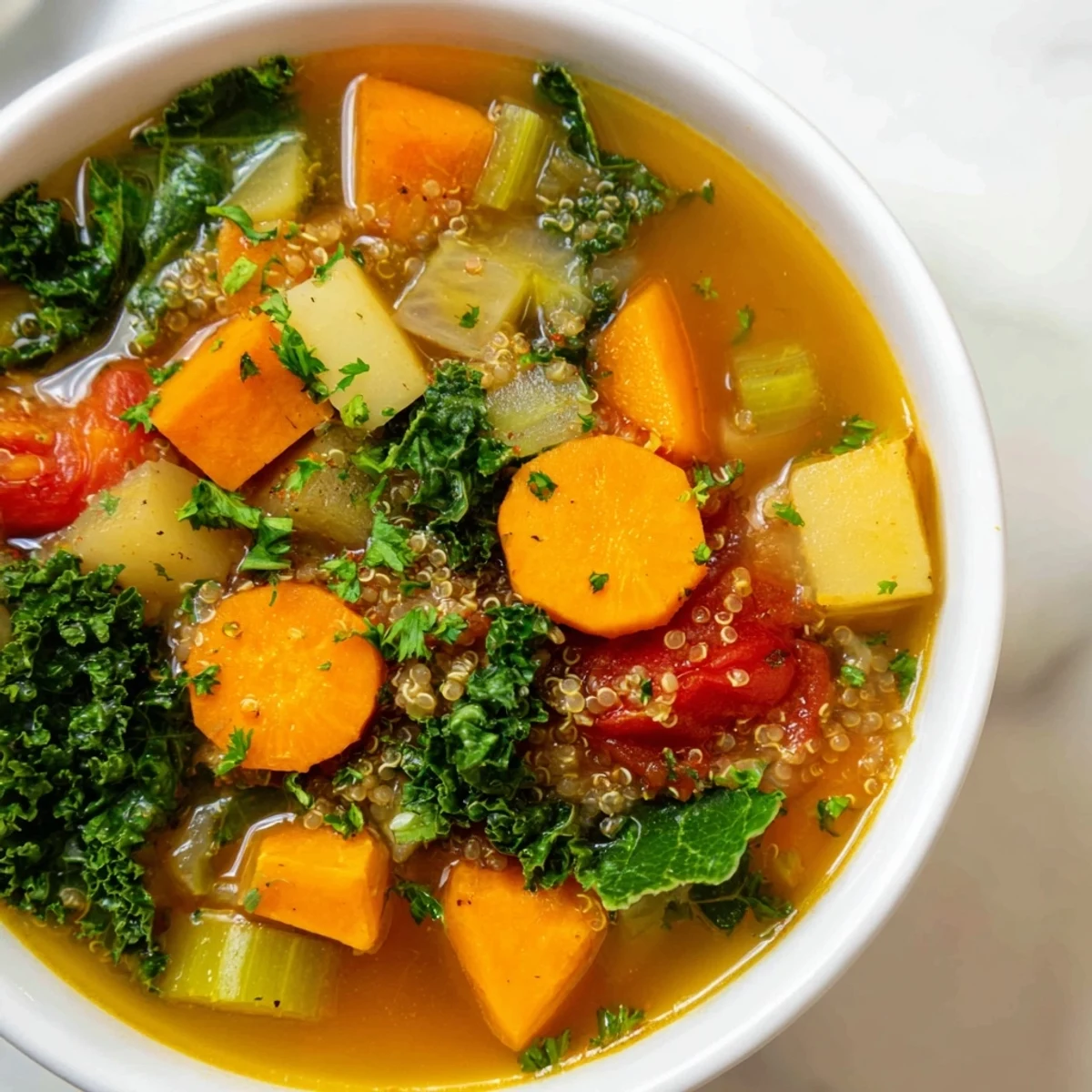 The soup includes carrots, celery, parsnip, sweet potato, kale (or Swiss chard), cabbage, and diced tomatoes.